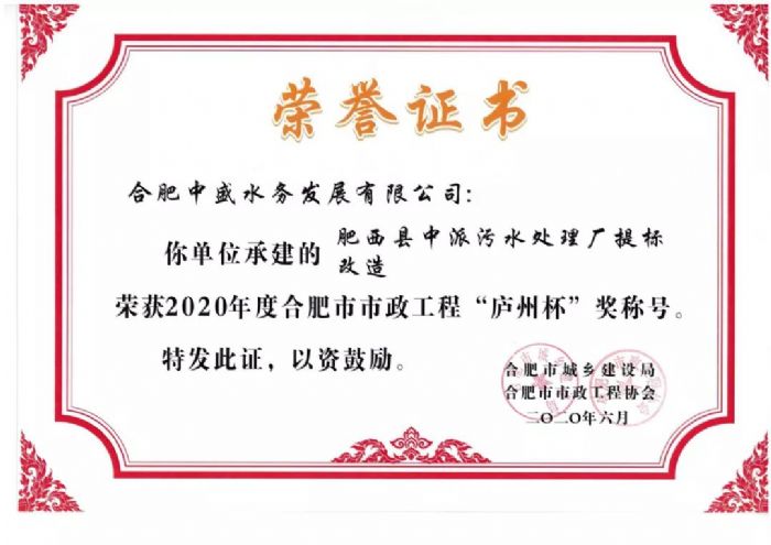 历经层层评选,由合肥中盛水务发展有限公司承建的“肥西县中派污水厂提标改造项目”荣获2020年度合肥市市政工程“庐州杯”奖。“庐州杯”奖是合肥市政工程质量的最高奖项,此次获奖,不仅是一项荣誉,更是对中盛水务管理水平和建设质量的肯定。